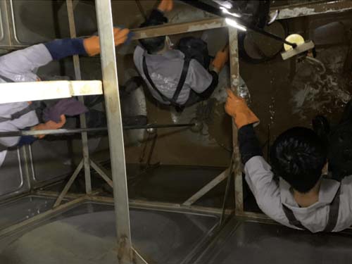 水箱清洗由里向外,均勻地噴涂箱(池)壁表面,可涂刷至入孔口,退出箱(池),蓋上孔蓋。 水箱清洗洗刷和檢查完畢,開排水閥或啟動潛水泵,排盡污水并用清水沖清,關閉排水閥或潛水泵。